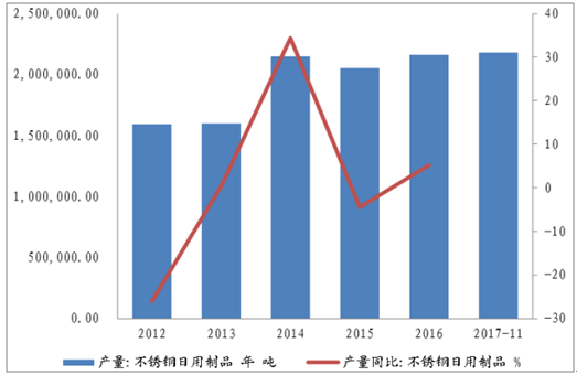 2015-2017年的產(chǎn)量可由不銹鋼日用品產(chǎn)量側(cè)面反映,在此期間,不銹鋼日用品產(chǎn)量穩(wěn)定增長,2016年不銹鋼日用品產(chǎn)量216.09萬噸,同比增長5.23%,截至2017年11月,不銹鋼日用品產(chǎn)量已達217.83萬噸,預(yù)計2017年將穩(wěn)速增長。